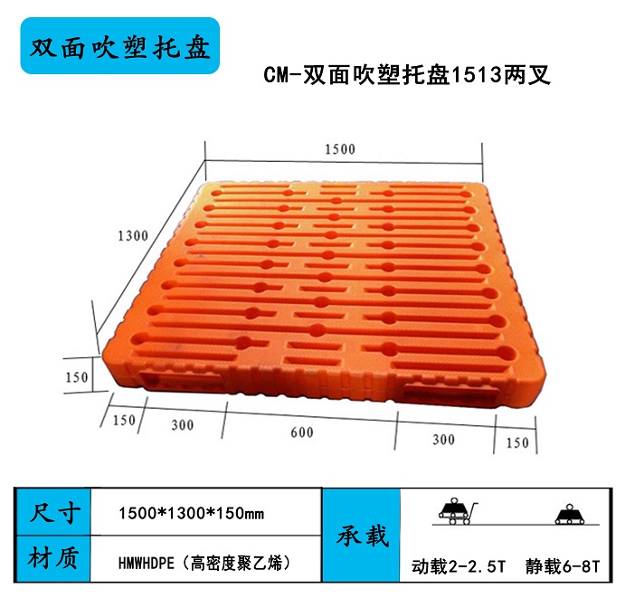 產品描述:1513雙面吹塑托盤,中空塑料托盤1.5*1.3米,1.5*1.3米塑料托盤大型叉車托盤